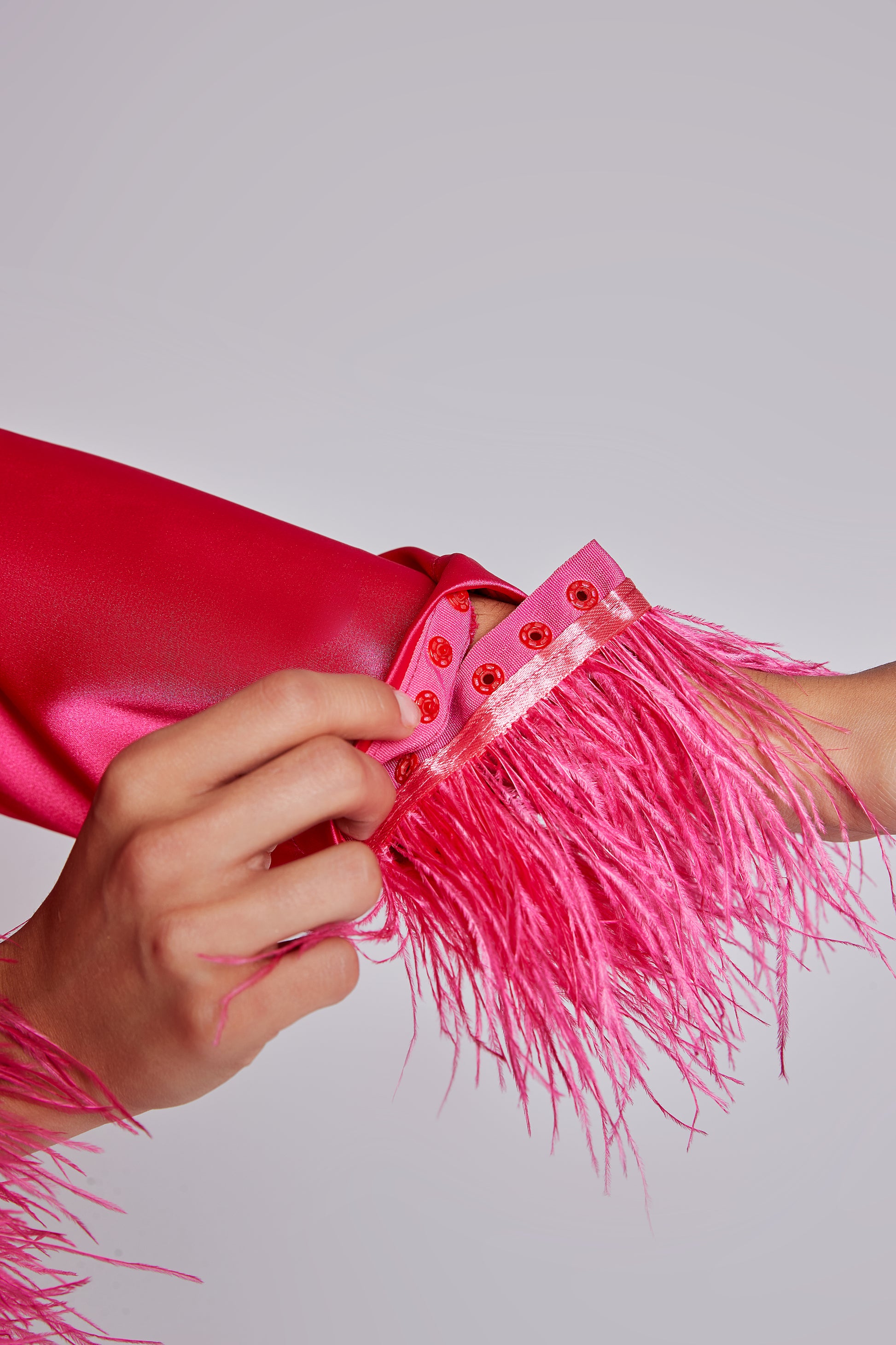 Button front shirt in high quality satin. Long sleeves with removable ostrich feathers. Two front pockets.